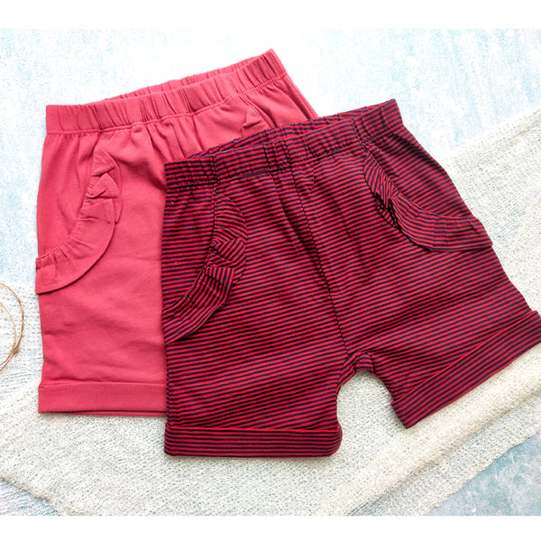 Our Girls Shorts Pinkish Red and Maroon Stripes are a style sensation that will bring fun to your fierce fashionista! With tantalizing frills and trusty pockets, these shorts have all the right moves to match tees, onesies, and tops. Perfect for a day at the beach or a night of outdoor adventure, these shorts bring tasteful style and unbeatable function. Pair them with baby tees or a top of your choice for a super stylish look.